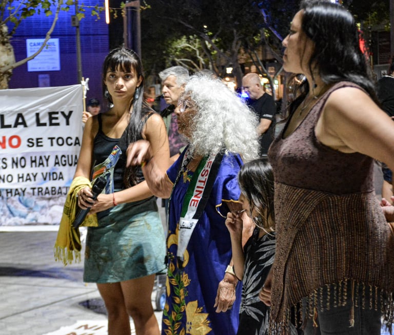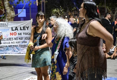 Bombos tambores, bailarinas, cánticos, asambleístas y vecinos recorrieron el microcentro sanjuanino bajo la consigna “El agua es de los pueblos”. La marcha partió desde la Plaza 25, continuó por Ignacio de la Roza hasta Avenida Rioja, luego por Avenida Libertador hasta Mendoza, para regresar al punto de partida. Allí se realizó un acto donde tomaron la palabra representantes de asambleas, organizaciones sociales y la guía espiritual del pueblo nación Warpe, quienes enfatizaron la importancia de que los legisladores escuchen a la ciudadanía y mantengan una normativa que funciona como resguardo de las cuencas hídricas.