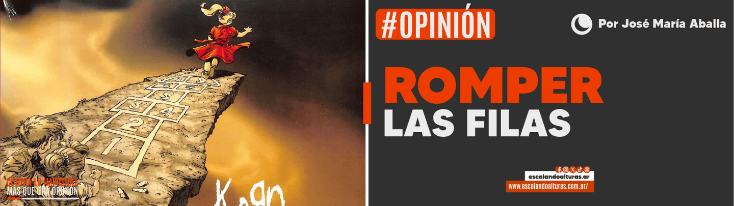 La escena es inquietante: una rayuela dibujada sobre la tierra termina en el borde de un precipicio. Una nena avanza, casi danzando, hacia el vacío. Detrás, otros chicos esperan su turno, atentos, listos para saltar detrás de ella. Nadie parece mirar más allá del último casillero. Nadie parece preguntarse qué hay después. “Sigue al líder”. Y el abismo deja de ser una posibilidad para convertirse en destino.